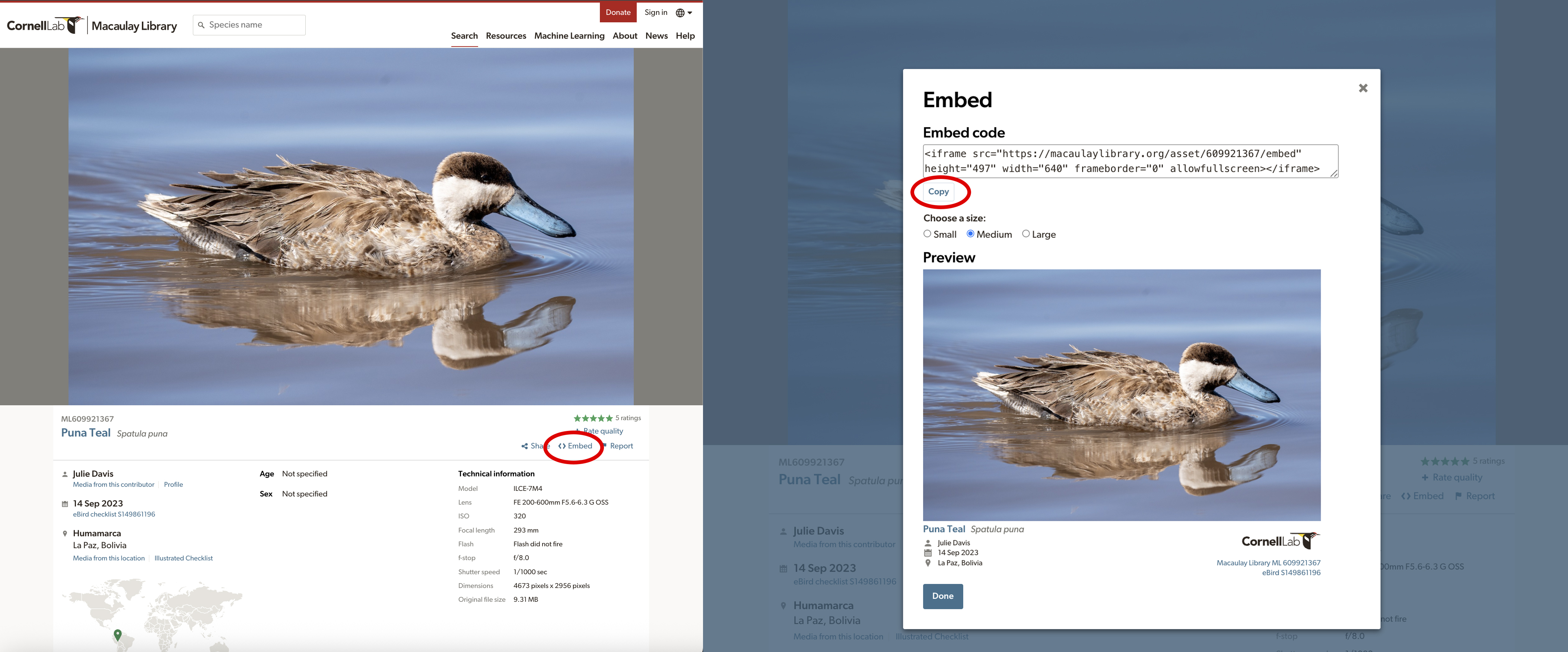 It's easy to embed Macaulay Library media on websites or other pages on the internet. Simply go to the Macaulay Library page for the piece of media you are interested in and click "Embed." From the embed menu, choose your preferred size, then click "Copy" to copy the HTML code for use on your page. The appropriate data and credit will automatically display along with the image, sound, or video.