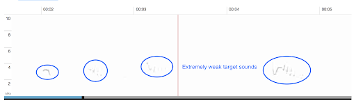 En este espectrograma, hay muy poco contraste entre los tres sonidos descendentes objetivo (marcados con un círculo) y el ruidoso fondo gris.