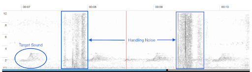 Si una grabación contiene una cantidad significativa de ruido de manipulación —ruido generado por el/la sonidista de campo al mover, golpear o presionar excesivamente su micrófono o teléfono inteligente— considera descontar una estrella de la calificación que la grabación podría recibir. A continuación, se muestra un ejemplo de una grabación con ruido de manipulación prominente:
